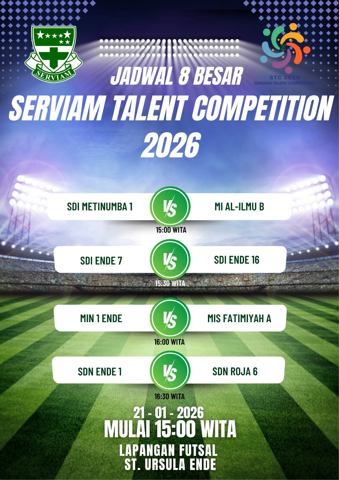 MIN 1 Ende (Humas) – Prestasi membanggakan kembali ditorehkan oleh Madrasah Ibtidaiyah Negeri (MIN) 1 Ende dalam ajang Serviam Talent Competition (STC) 2026 tingkat sekolah dasar. Pada cabang Turnamen Futsal STC 2026, tim futsal MIN 1 Ende tampil gemilang dengan meraih kemenangan di beberapa pertandingan sekaligus, sehingga memastikan langkah ke babak 8 besar.